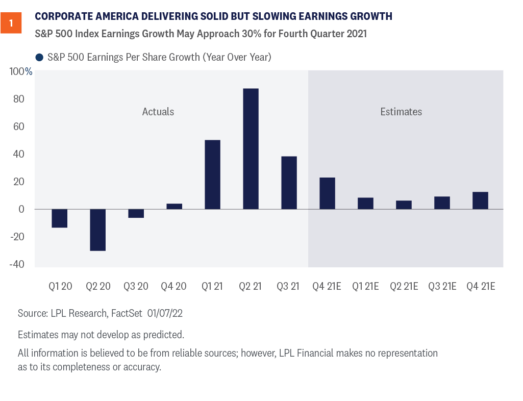 Corporate America has been on quite a run. Coming into 2021, S&P 500 Index companies were expected to generate less than $170 in earnings per share. As 2022 begins, it looks like that number may end up higher than the latest LPL Research estimate of $205, one of the biggest earnings upside surprises ever and a big reason why stocks did so well last year. But 2021 earnings are not yet fully in the books. We have one more quarter to go, which we preview here.