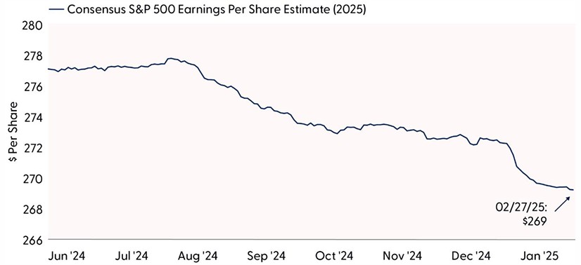 Earnings grew rapidly in the fourth quarter with solid upside surprises, but the road ahead gets tougher. Companies not only did a good job managing costs and currency headwinds last quarter, but they also waded through policy uncertainty quite well. Doing that again in 2025 will be more difficult as tariffs go into effect and trade tensions potentially ratchet higher as the economy likely slows. Higher productivity following heavy technology investment may help, but with so much uncertainty, it seems prudent to factor in some additional earnings downside. We reiterate our forecast for high-single-digit growth in S&P 500 EPS in 2025, below current consensus estimates calling for a 12% increase. We believe that’s enough to support similar mid-to-high single-digit gains for stocks this year, though the ride to get there may be bumpy.