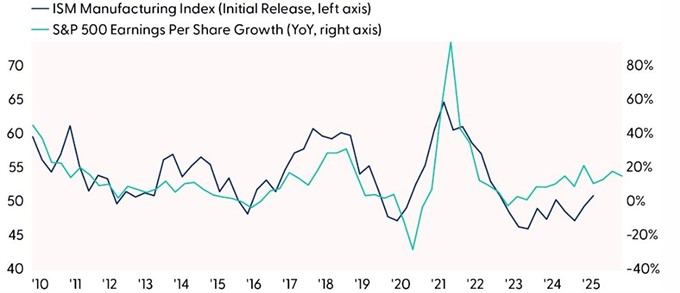 An improving manufacturing outlook was supportive late last year. Historically, the Institute for Supply Management (ISM) Manufacturing Index has correlated well with S&P 500 earnings growth because earnings are more manufacturing-driven than the more consumer-oriented economy.