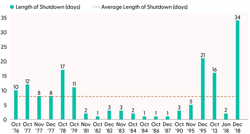 Disclosure: Data includes showdowns/funding gaps from 1976–YTD. Only 1/4 of the government was shutdown from December 2019–January 2019