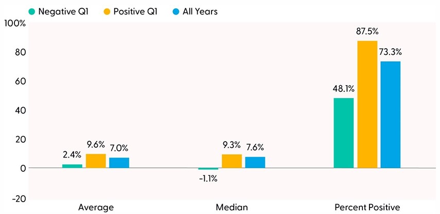 S&P 500 Performance from April Through December Based on Positive or Negative Q1 (1950–2024)