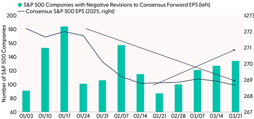 While technology spending is part of the story, we believe analysts are just waiting for more clarity on tariffs. Expect the latest consensus estimate for S&P 500 earnings per share (EPS) near $269 to fall in the weeks ahead. Companies have started to guide estimates down some, which will be more frequent in late April through May during the bulk of earnings season. For now, we feel good about our $260 estimate (an 8% increase), factoring in a couple points of downside from tariffs, with slightly more downside risk than upside potential.