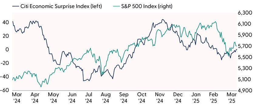 That doesn’t diminish the fact that markets currently face two big challenges at the same time. A slowing economy would have already caused recession fears to increase. Our recession odds for the next 12 to 18 months are now at 30%. Add in tariff uncertainty, which has dented consumer confidence, and you have the recipe for a jittery market. As economic growth expectations have weakened, with economic data increasingly missing expectations in recent weeks, stocks have fallen.